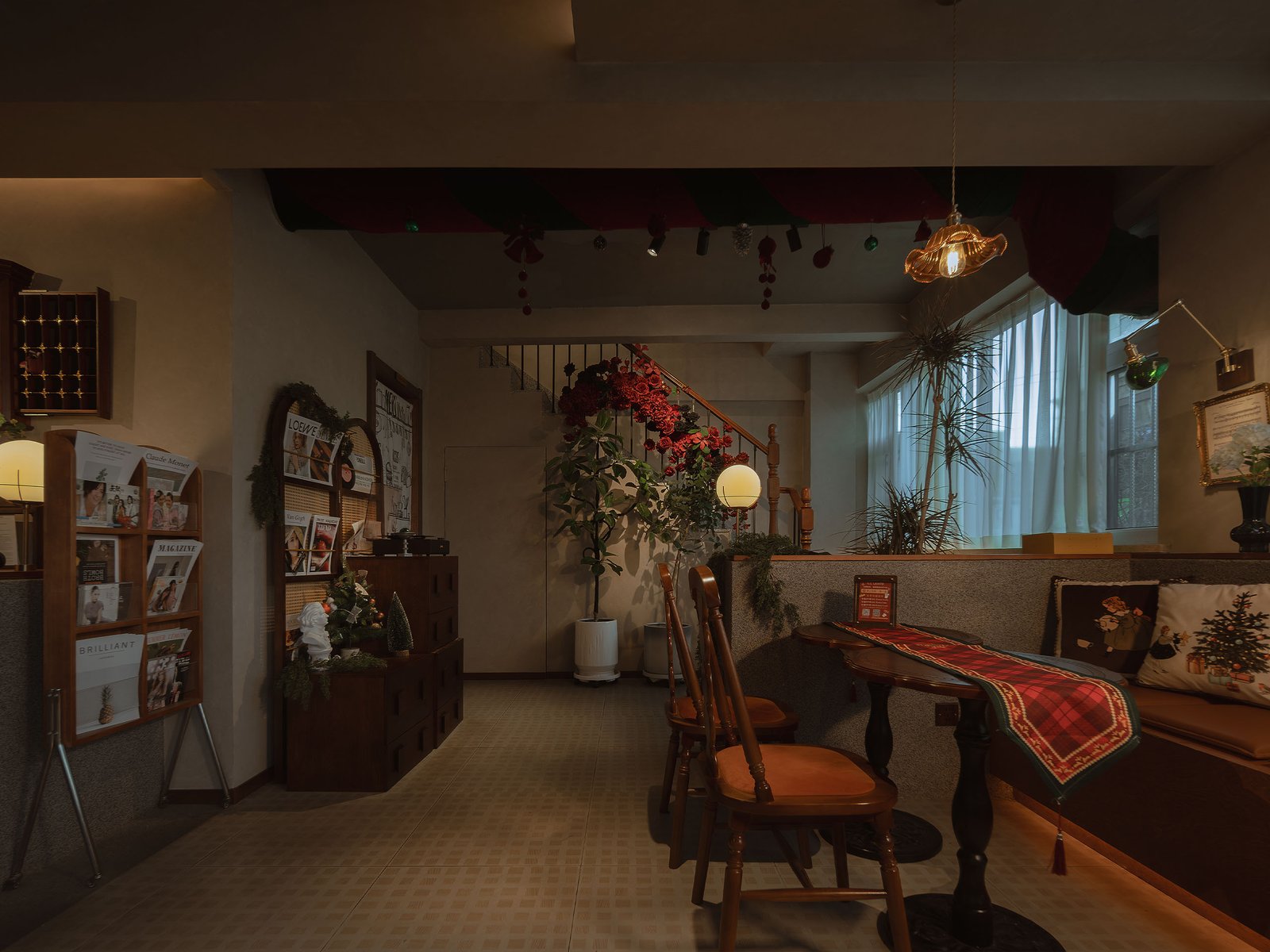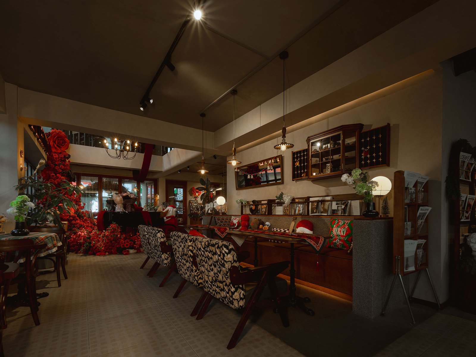 Ce café séduit par une atmosphère chaleureuse et profondément scénographiée, où chaque détail participe à une mise en scène élégante et accueillante. Les volumes sont mis en valeur par une lumière douce et tamisée, mêlant suspensions vintage, éclairages ponctuels et jeux de reflets qui créent une ambiance intime, presque théâtrale. Les matériaux naturels dominent l’espace : bois chaleureux, tissus texturés, céramiques et finitions mates apportent une sensation de confort immédiat. Les éléments décoratifs, soigneusement choisis, évoquent un esprit rétro et artisanal, renforcé par des compositions florales généreuses et des touches saisonnières qui donnent vie au lieu.