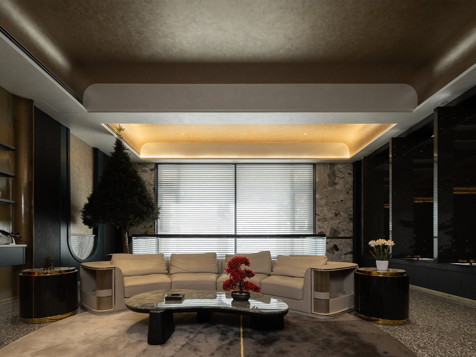 L’intérieur se distingue par une composition spatiale subtile, où chaque pièce se déploie avec cohérence autour d’un langage esthétique unifié. Les plafonds caissonnés et rétroéclairés créent une atmosphère enveloppante, tandis que les menuiseries en bois noir à croisillons dorés apportent une profondeur graphique. Chaque zone, de la salle de réception à l’espace lounge, a été pensée dans une logique d’équilibre entre fonctionnalité, confort et mise en scène. Ce projet incarne un art de vivre d’exception, où la grandeur du patrimoine rencontre l’exigence du design contemporain.